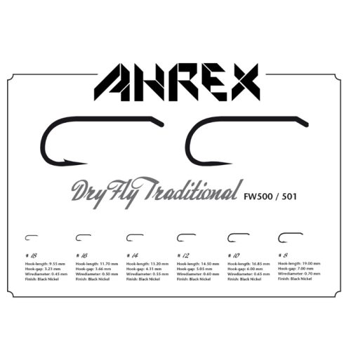 AHREX FW500 Dry Fly Traditional Barbed on klassisen näköinen pintaperhokoukku, jossa on kaikki hyvän pinturikoukun ominaisuudet. Erinomainen yleiskoukku, johon voi sitoa monenlaisia sidoksia.
