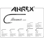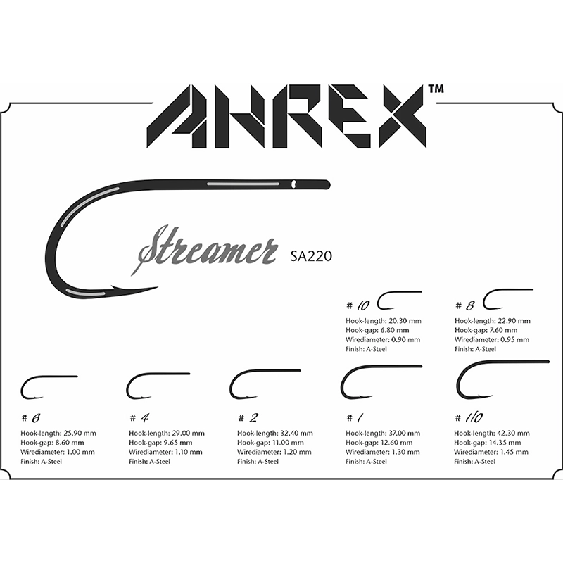 AHREX SA220 Streamer S/E on suoralla varrella ja suoralla silmällä varustettu luotettava streamer-koukku, jossa on tavanomasta vahvempi lanka ja hieman lyhyempi varsi. Tämä koukku on selvä valinta lähes mihin tahansa perhoon ja erinomainen yleiskoukku myös suolaisen veden perhoihin.