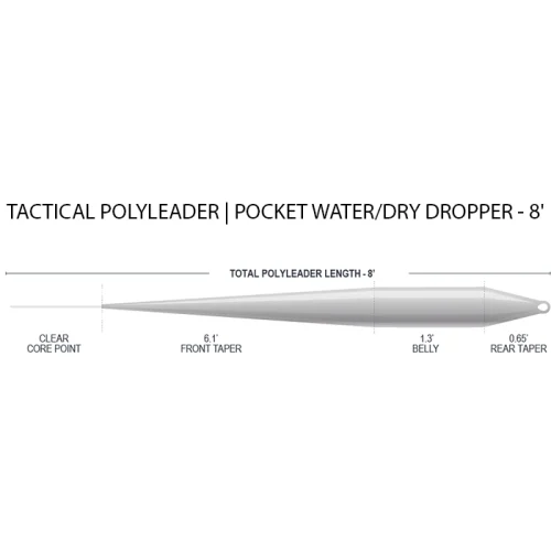 Pocket Water Floating 8′ – Kehitetty pocket-kalastukseen sekä nymfailuun pintureiden kanssa. Tämä voimakkaasti kartioitu polyleader auttaa oikaisemaan vaivatta 4–6 jalkaa / 1,2–1,8 metriä pitkät perukkeet ja perholitkat. Se sopii erinomaisesti tarkkoihin lyhyen etäisyyden kalastustilanteisiin. Tyvipäässä on täydellisesti muotoiltu hitsattu lenkki, jonka avulla voit helposti kiinnittää sen suosikkiperhosiiman etupäähän lenkki-lenkkiin -liitoksella. Mukana tulevan 1,5 mm:n tippet ring -renkaan voit kiinnittää haluamallasi solmulla tai luoda lenkki solmun lenkki-lenkkiin-kiinnitystä varten.