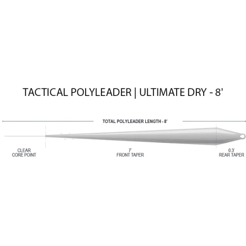 Ultimate Dry Floating 8´ – Suunniteltu pintureiden herkkään ja tarkkaan presentaatioon. Lisää vain 4–10 jalkaa / 1,2–3 metriä peruketta maksimaalisen huomaamattomuuden, hallinnan ja herkkyyden saavuttamiseksi. Tyvipäässä on täydellisesti muotoiltu hitsattu lenkki, jonka avulla voit helposti kiinnittää sen suosikkiperhosiiman etupäähän lenkki-lenkkiin -liitoksella. Mukana tulevan 1,5 mm:n tippet ring -renkaan voit kiinnittää haluamallasi solmulla tai luoda lenkki solmun lenkki-lenkkiin-kiinnitystä varten.