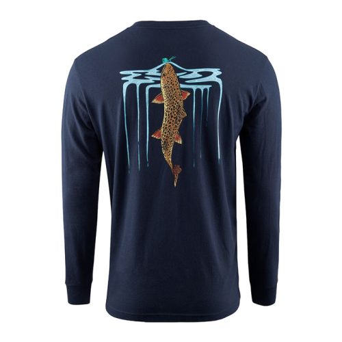 GRUNDENS Riser LS / Long Sleeved T-Shirt on pitkähihainen paita perhokalastukseen ja kaikkeen vapaa-aikaan. Paidan printti kuvaa pinnassa ruokailevaa taimenta, jota on taianomaista katsella.
