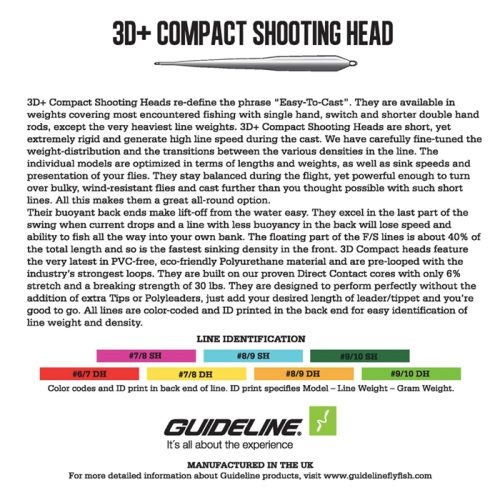 GUIDELINE 3D+ Compact Shooting Heads -ampumapää on saatavilla siimaluokissa, jotka kattavat useimmat ja tavallisimmat yksikätiset- switch- ja lyhyemmät kaksikätiset vavat, lukuun ottamatta kaikkein raskaimpia siimaluokkia.