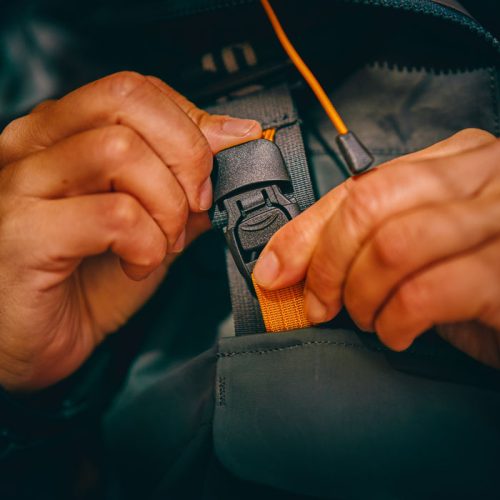 - Tilava etutasku joka pitää veden loitolla ja taskun tavarat kuivana, vetoketju suojattu läpällä