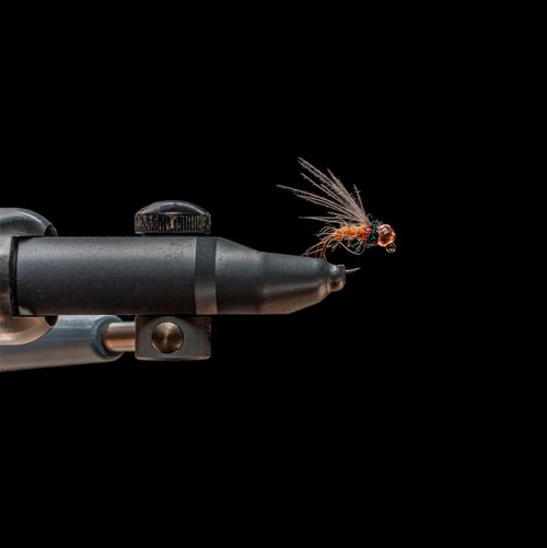Kuvassa kolminkertaisen perhokalastuksen suomenmestarin ja Ikon Fishing Products:in Mikko Räsäsen sitoma Red Ribbed Killer, jonka kierteenä on käytetty Fluoro Thread fluorolankaa värissä Fl. Hot Orange n.1.