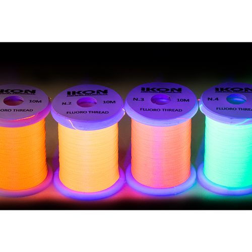 IKON Fluoro Thread -Fluorolanka on voimakkaasti fluorisoiva lanka erityylisten iskupisteiden tekoon. Ikonin fluorolangoilla tehdään mm. Ribbed Nymph tai Red Ribbed Killer perhojen kierteet ja Orange Tag perhojen perät.