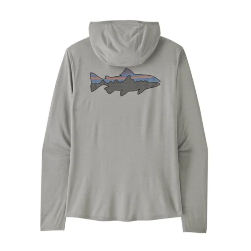 PATAGONIA Men’s Cap Cool Sun Hoody – Fitz Roy Trout on Patagonian suojaavin tekninen paita/huppari, joka tarjoaa 40+ UPF -aurinkosuojan sekä erinomaisen kosteudensiirron ja nopean kuivumisen. Yksirakenteinen rakenne luo luonnollisen auringonsuojan, joka ei kulu pesussa. Valmistettu 100 % kierrätetystä polyesterijerseystä. Kaikki Capilene® Cool Sun -tuotteet on suunniteltu säätelemään kehon lämpöä pitkinä, aurinkoisina päivinä vedellä tai vuoristossa, kun hikoilu on väistämätöntä. Valmistettu reilun kaupan Fair Trade Certified™ -tehtaassa.