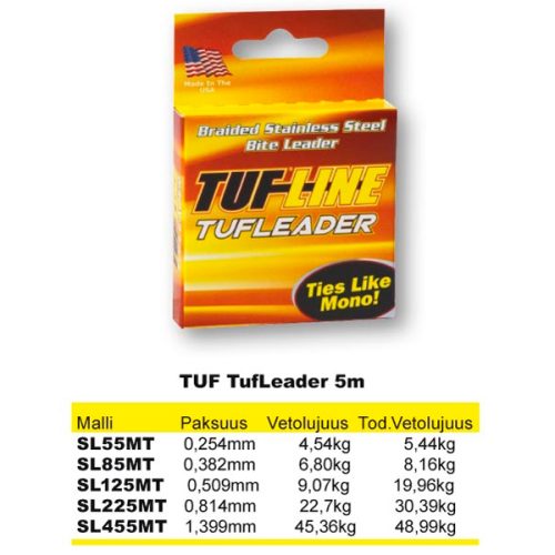 TUFLINE TufLeader -haukiperuke on hauen perhokalastuksessa käytetty puruperuke, jota on helppo solmia käsin. TufLeader on edistyksellinen, ruostumattomasta teräksestä ja Spectra® -kuidusta valmistettu perukemateriaali. Se on valmistettu ja suunniteltu erityisesti terävähampaisia kaloja varten. Ainulaatuisen rakenteensa ansiosta, sen solmimisessa voidaan käyttää normaaleja, kuten Albright ja Palomar solmuja. Se on valmistettu ainutlaatuisella kolmoiskomponentti menetelmällä. Spectra® -kuitu ydin ja sitä ympäröivä T-304 ruostumaton teräs takaavat korkeimman mahdollisen solmun- ja kulutuksenkestävyyden.