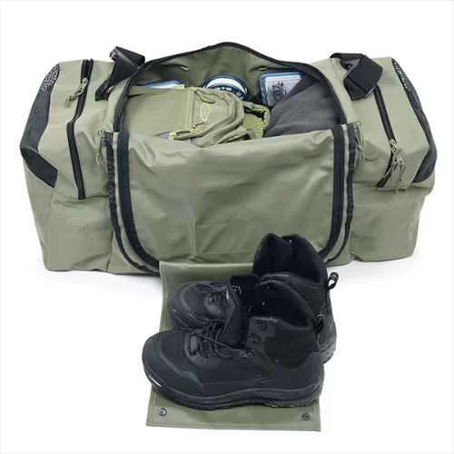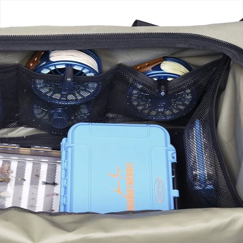 VISION All In One Bag on valmistettu vahvasta ja kestävästä 600 denierin Oxford polyesteri kankaasta ja tarjoaa kaikki ominaisuudet, jota perhokalastus laukulta odotat. Kahluuvarustelaukku on tarpeeksi iso, joten sinne mahtuu kaikki; Kahluukengät, kahuuhousut, neopreenisukat, kahluutakki, kalastustarvikkeet, perholiivi, perhokelat… Laukussa on U:n muotoisella vetoketjulla varustettu iso päätasku kuiville varusteille. Päätaskun seinämillä on useita verkkotaskuja perhokeloille, siimoille ja tarvikkeille. Laukun päätaskun kannesta avautuu pukeutumisalusta, joten sen päällä on näppärä pukea ja riisua kahluuvarusteet. Ulkopuolella on kaksi tilavaa päätytaskua mesh yläosalla kastuneille varusteille, jolloin ne eivät kastele päätaskun kuivia varusteita. Lisäksi laukusta löytyy yksi sivutasku, johon mahtuu runsaasti tarvikkeita.